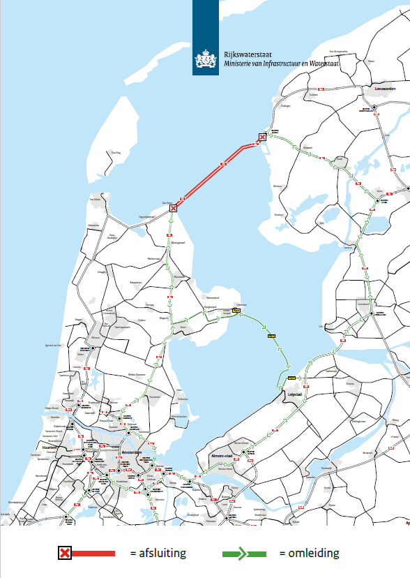Wegverkeer wordt omgeleid via de A9/A1 en A6 of de Houtribdijk. Afhankelijk van je route loopt de extra reistijd op van 10 minuten tot 90 minuten. Check je route voor vertrek op vananaarbeter.nl.