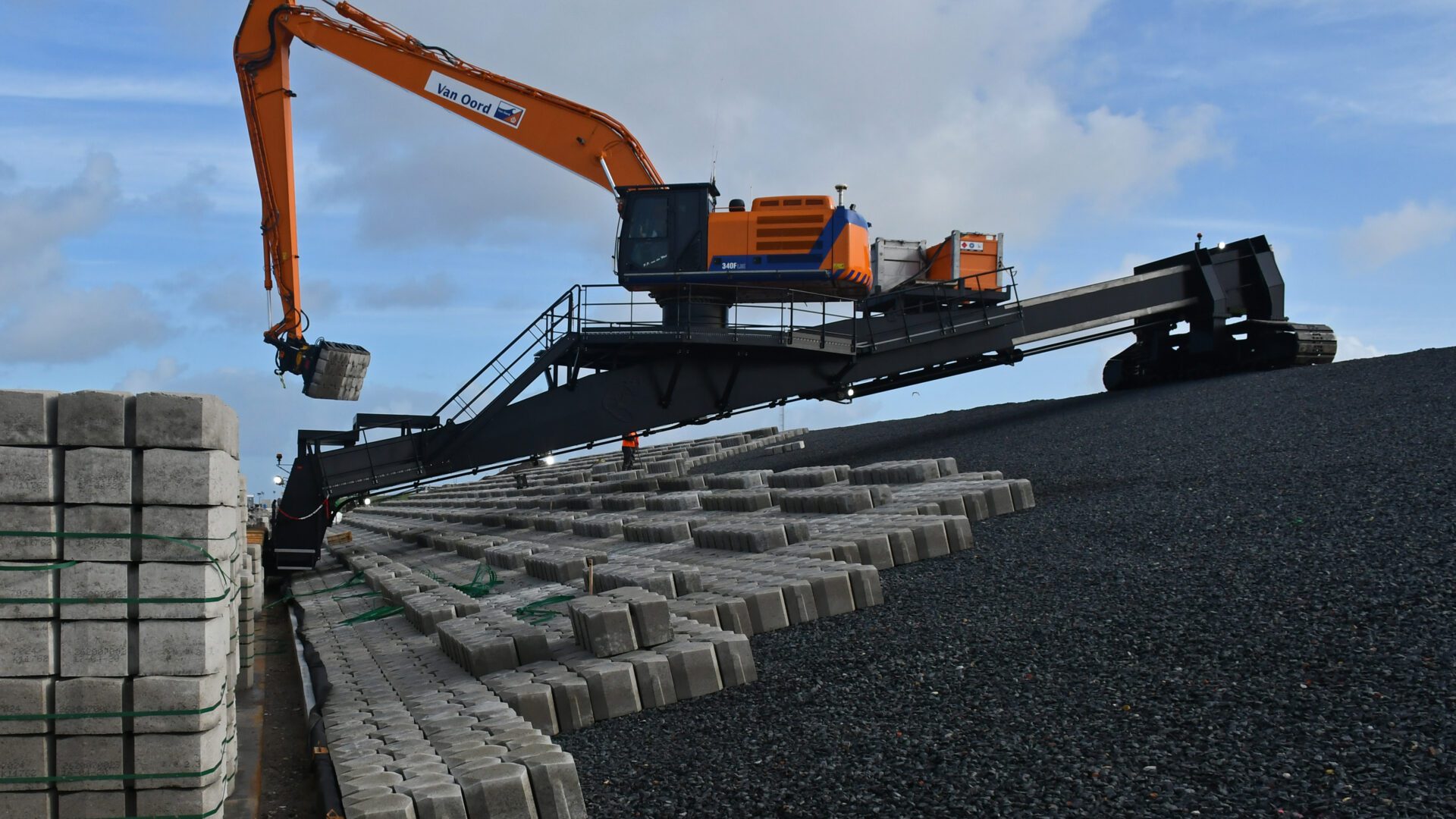 Vanaf de tenderfase werkte Levvel aan het verleggen van grenzen in de waterbouw. De schaal en uniformiteit van de Afsluitdijk boden kansen voor innovatie, maar vroegen ook om uiterste zorgvuldigheid. “Elke verrassing kan zich immers over 32 kilometer herhalen,” aldus Sjoerd van den Steen, ontwerpmanager bij Levvel. De meest opvallende innovaties zijn de nieuwe bekledingselementen: het Levvel-bloc op het ondertalud en het ribbelpatroon van de Basalton-Quattroblock zetstenen op het boventalud. Beide zijn uitgebreid getest met schaalmodellen in golfgoten. Niet alleen op stabiliteit, maar ook om toleranties tijdens aanleg en onderhoud vast te stellen. Van den Steen: “Dankzij deze aanpak konden we circa 60% beton besparen ten opzichte van een traditioneel ontwerp.” Ook in de uitvoering koos Levvel voor slimme oplossingen. Zo werden twee unieke plaatsingsmachines ontwikkeld, de Ballerina en de Titaan, een tijdelijke vaargeul gebaggerd langs de dijk en een semi-automatische fabriek gebouwd voor de productie van 70.000 Levvel-blocs.